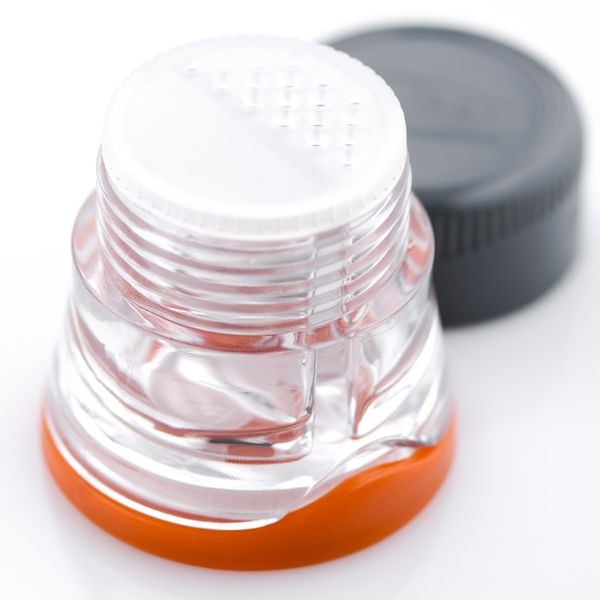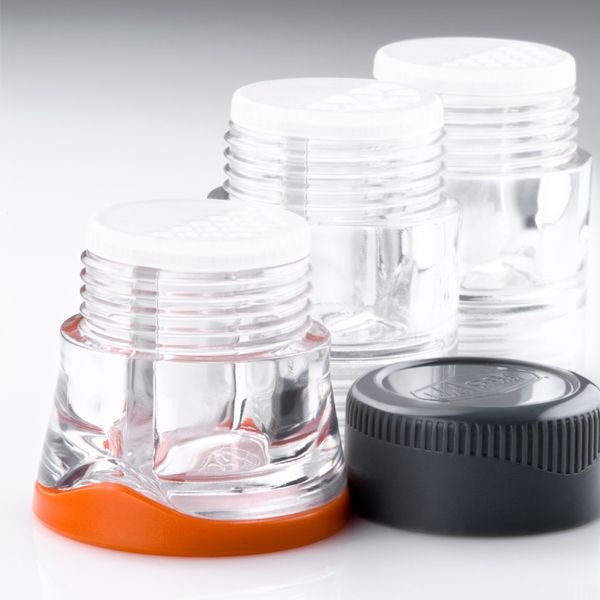 6種類のスパイスを持ち歩ける2気室3段の調味料入れです。それぞれの段はねじ込みで着脱が可能で不必要なケースを外すことも追加することもできます。段毎に穴の付いた内蓋があり、1つは大きめの穴の内蓋となっています。透明度が高く見分けやすいケースです。