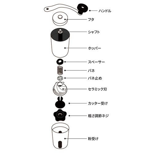 材質:〔本体〕ステンレススチール〔刃〕セラミック〔内側粉受け〕アクリル樹脂〔粗さ調節ネジ・バンド・スペーサー〕ABS樹脂〔カッター受け〕ナイロン樹脂