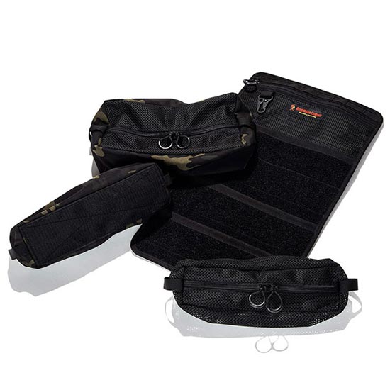 カトラリーや調理器具を入れ、クルッと巻いて収納できる、シェフズロールです。開いた状態でツールハンガーなどに吊して使うこともでき、必要な物をすぐに取り出せます。それぞれのバッグは取り外し可能で、単体でポーチとして使うこともできます。