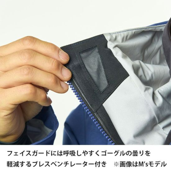 呼吸を容易にするブレスベンチレーター付きのフェイスガード、袖口からの雪の侵入を抑えるダブルカフなど、「遊び手」目線の細やかなギミックを配し、雪上でのあらゆるストレスを軽減。ファイントラック史上、雪山最強のハードシェルです。