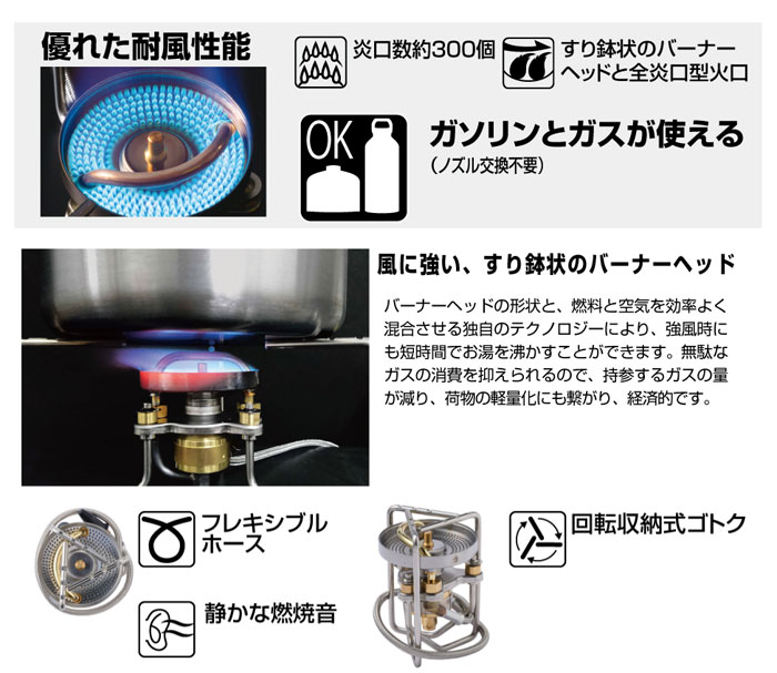 ノズル交換なしでガソリンとガスボンベ(OD缶)、どちらの燃料も使うことができるハイブリッドなストーブ。どちらの燃料を使っても面倒な予熱作業は必要ありません。また、優れた耐風性も特徴のひとつ。全炎型の火口とせり上がったすり鉢状のバーナーヘッドにより、優れた耐風性を実現。