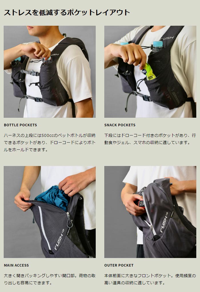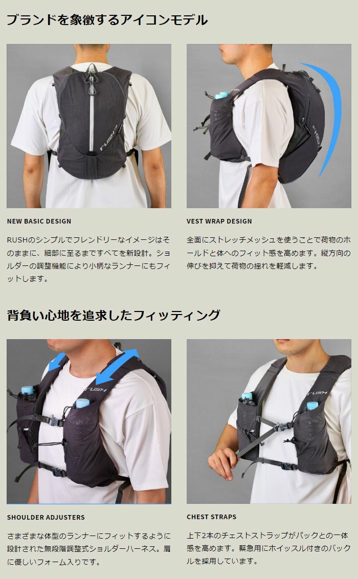 NEW BASIC DESIGN:RUSHのシンプルでフレンドリーなイメージはそのままに、細部に至るまですべてを新設計。ショルダーの調整機能により小柄なランナーにもフィットします。