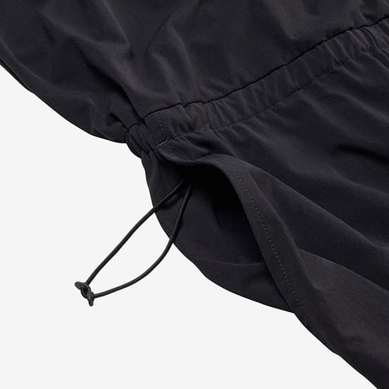 ゆとりを持たせたウエスト回りはスピンドル仕様でフィット感を調整可能で、ドレープをきかせて着用できます。さまざまな動きに対応できるように、背面は留め具のない生地が重なり合うラップ仕様で、着脱も容易。ヨガ、ジョギング、ウォーキングなど幅広いスポーツシーンから日常のカジュアルシーンまで活躍するアイテムです。