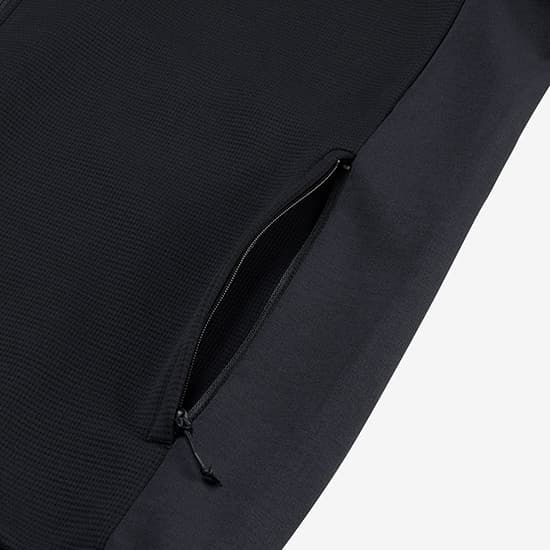 生地の肌面に、はっ水糸を使用することで、汗を素早く表面に吸い上げて、ドライ感をキープ。メイン素材のポリエステルを使用したジャージー素材は高いストレッチ性でやわらかく、適度な肉厚感の生地で保温性を備えながらも、吸汗速乾性にも優れています。脇には速乾性とストレッチ性を備えた軽量なスウェット生地を配置し、さまざまなアクティビティの動きに追従。