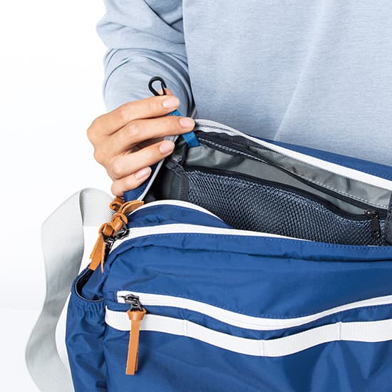 A4ファイルも収納可能な大きなコンパートメントを備え、色々な用途に合わせて荷物が整理しやすい構造。サイドのポケットにはボトルや折りたたみ傘を収納可能。