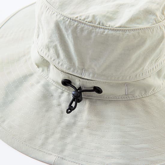 はっ水性とUVカット性に優れた生地(UPF50+)を使用した、カリマーの定番ハット。降雨や日差しの直射から頭部を保護しつつ、本体周囲に配置されたベンチレーションで帽子内部の蒸れや頭部のオーバーヒートを効果的に防止。ドローコードでサイズ調整が可能。頭周りの汗止めテープには抗菌防臭加工(SEK認証)された素材を使用。取り外しできるあご紐付き。