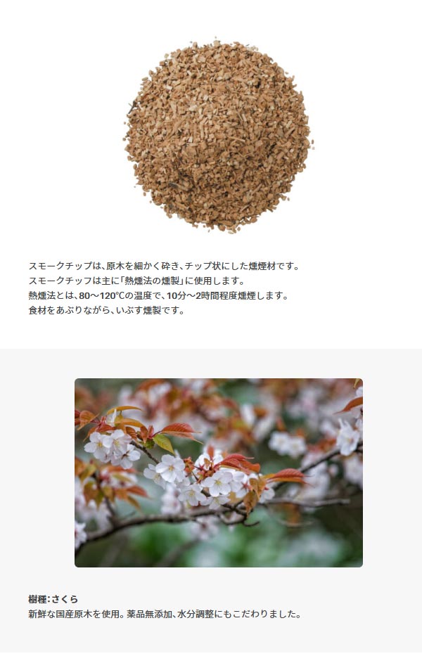 新鮮な国産原木のみを使用した熱燻に便利なスモークチップ。